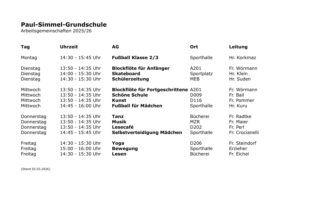 Unsere Fußball-AG am Mittwoch richtet sich an alle fußballbegeisterten Jungen der 2. bis 4. Klasse und an alle Mädchen ab der 3. Klasse. Gemeinsam wollen wir spielen, lernen und vor allem Spaß mit dem Ball haben.