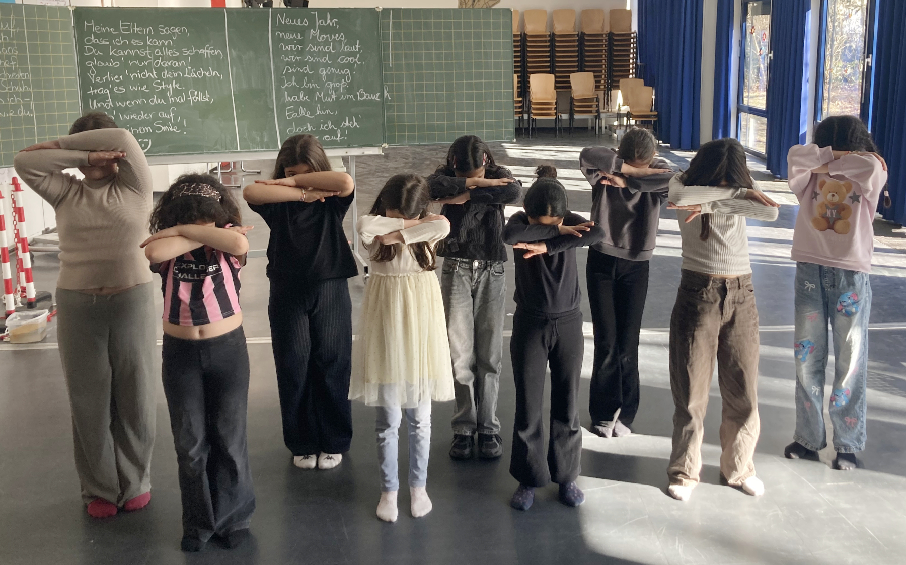 „Juhu, es ist soweit: der neue Song von Matondo ist da!“ Gleich beim ersten Hören hält es einige Kinder nicht auf ihren Plätzen und möchten sich zur Musik bewegen. Nur wie? Nicht jeder Mensch ist ein geborener Tänzer. Damit in Zukunft alle Schülerinnen und Schüler mittanzen können, basteln gerade junge Tänzerinnen an einer eigenen Choreographie! Jeden Donnerstag in der 7. Stunde im MZR werden, gemeinsam mit Frau Maier, neue Dance-Moves passend zu Text und Rhythmus ausgedacht, ausprobiert, wieder verworfen, nochmal neu probiert – bis sie eben für alle stimmig sind.
