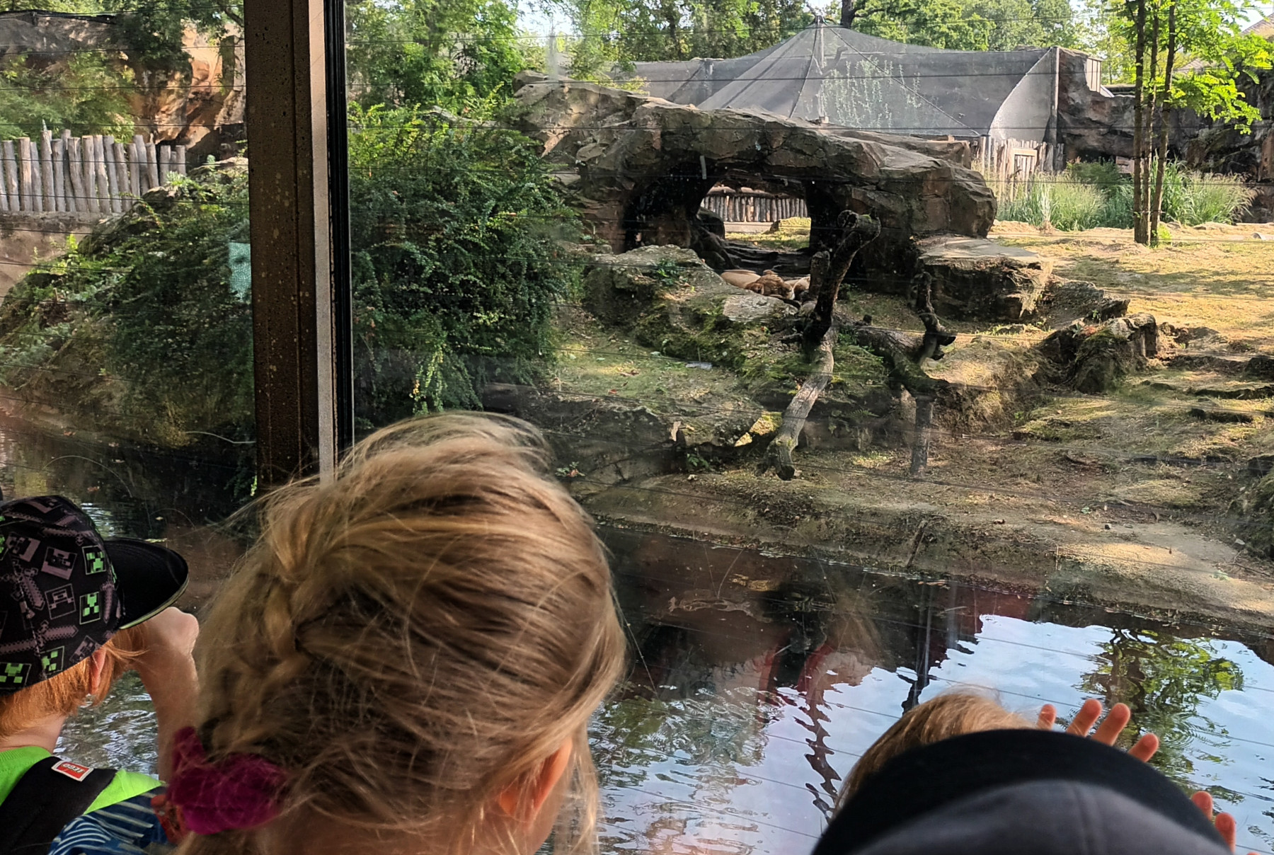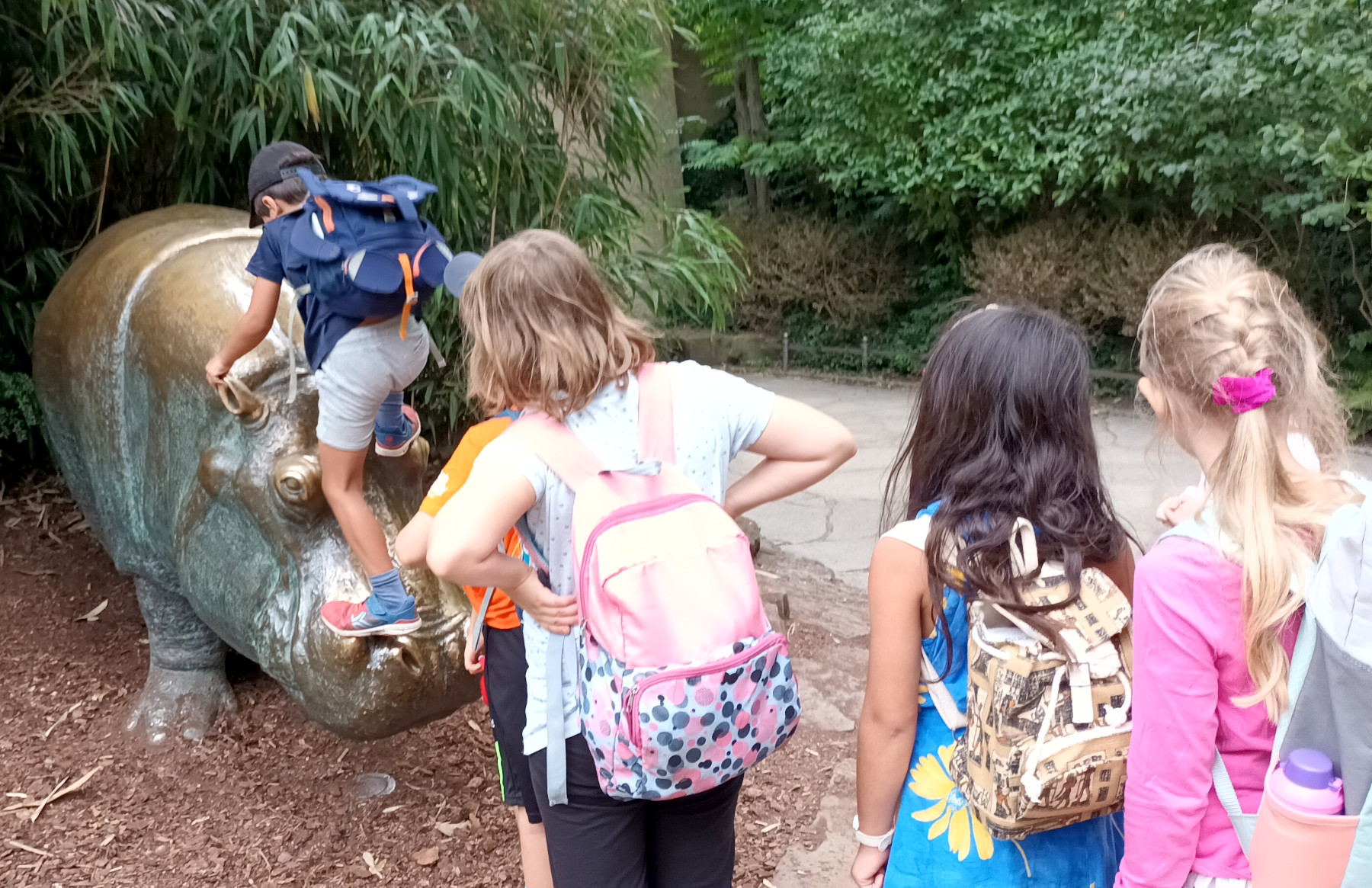 In den Sommerferien 2025 ging es gemeinsam mit den Erzieherinnen Frau Erol und Frau Steindorf und mit einigen Schülern und Lernanfängern zum Zoologischen Garten. Dort gab es Vieles zu entdecken. Gleich beim ersten Gehege versteckten sich die Löwen, dass sie erst beim zweiten Blick gesichtet wurden. Beim weiteren Rundgang ließ sich Meng Meng, die Panda Mama sehen. Sie hatte ordentlich Appetit und fraß genüsslich Bambusstäbe zum Frühstück. Leider verging die Zeit zu schnell, so dass wenigstens noch die Elefanten und Giraffen bestaunt werden konnten. Ein kleines Picknick gab es auch am Spielplatz bei den Bären. Wer sich traute, konnte sich auch an „Knautschke“ versuchen. Dabei handelt es sich um eine Bronzefigur, was ein Nilpferd zeigt, das in den 50er Jahren viele Besucher anzog und zu einer gewissen Berühmtheit im Zoo wurde. Das Klettern auf dem Tier bereitete den Ferienkindern jedenfalls viel Freude.